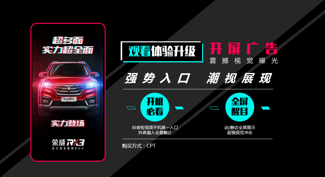 抖音開屏廣告以巨幅圖片或視頻的形式在抖音APP啟動時展現(xiàn),廣告的展現(xiàn)時間為用戶打開APP的第一時間,用戶對廣告信息的接收度高,同時,以相對酷炫的效果在APP啟動時自動展現(xiàn),給用戶的視覺和感官上的沖擊都非常高。